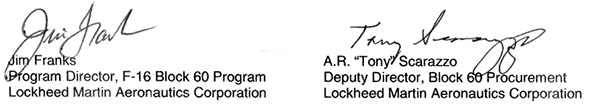Successfully accomplishing contract events directly contributes to the well-being of both our companies. We look forward to continuing with F-16 Block 60 contract activities and having you as our partner as we achieve future program milestones collectively.