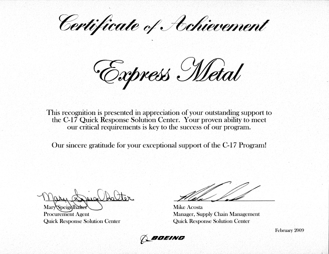 It is with great appreciation and respect that The Boeing Company congratulates Express Metal Aerospace, Inc. for achieving superior supplier performance. Express Metal Aerospace, Inc. has maintained a Silver composite performance rating for each month of the performance period from Oct. 1, 2007, to Sept. 30, 2008.